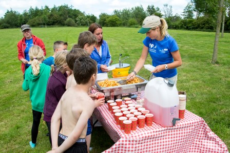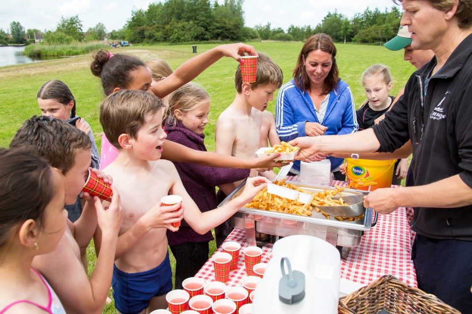 De pauze wordt gehouden op een mooie plek aan het water. De kinderen kunnen hier voetballen, zwemmen en er is de mogelijkheid (vooraf) patat te bestellen. Omdat alle onderdelen in of aan het water plaatsvinden is het meenemen van droge kleding een must!